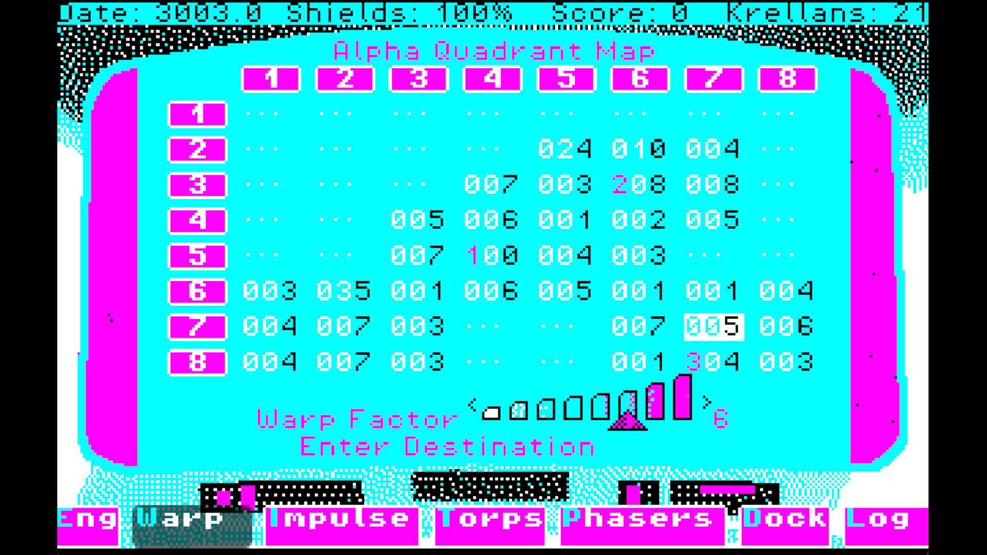 It was a FORTRAN version of "Star Trek" that inspired Nels Anderson to write a version for the PC in around 1989. He upgraded the plain ASCII graphics to take advantage of new 16 colour hardware made by IBM called the Enhanced Graphics Adapter (EGA). EGA was a big upgrade over IBM's earlier Color Graphics Adapter (CGA) which effectively* did 4 colours.