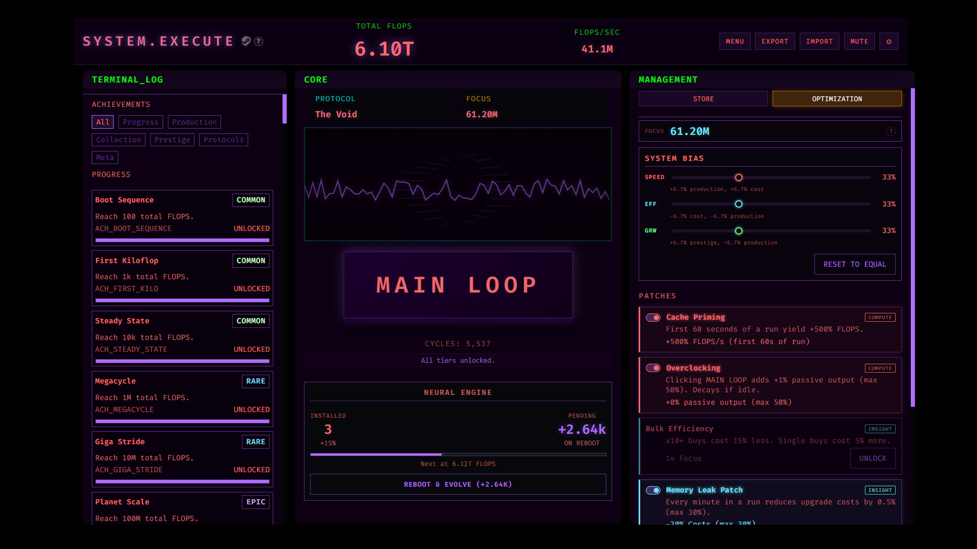 - Recursive Narrative: Uncover milestone logs and cryptic terminal fragments as your lifetime FLOPS reach unprecedented scales. Eleven narrative milestones and protocol-specific story fragments react dynamically to your choices and progression.